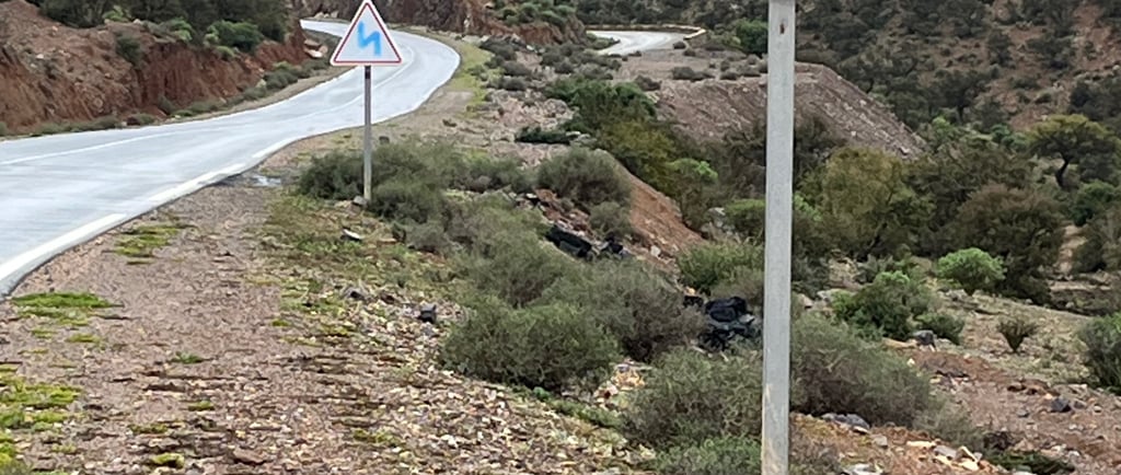 Le panneau qui tue… une fois passé tu sais que tu as des pentes à plus de 10%… et que les cuisses vont chauffer pour monter les 130kg jusqu’au col. Justement, aujourd’hui il y avait deux cols à plus de 500m à passer, passage obligé pour sortir de l’Anti-Atlas.