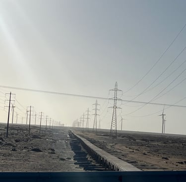 En quittant El Marsa ce matin, je tombe sur l’usine de phosphate que je longe coté Est sur 12 km… l’enceinte fait plus de 100km2 et un énorme tapis roulant alimente en minerai depuis la mine.
