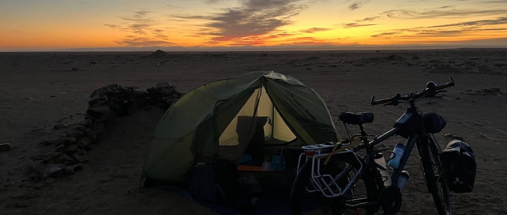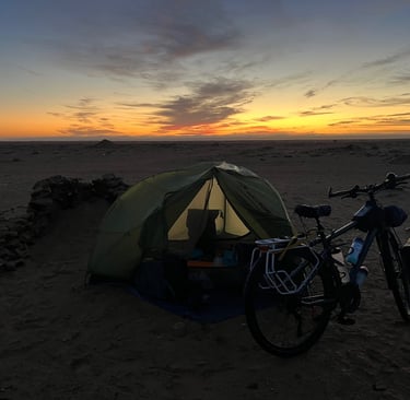 Levé de soleil magnifique sur le désert, mais un froid de canard. Exposé au vent et ciel couvert, la rosée du matin a complètement mouillé la tente qui ne sèche pas. Je suis obligé de tout plier mouillé. À 10h00 je mets les gants longs d’hivers, tellement il fait froid.