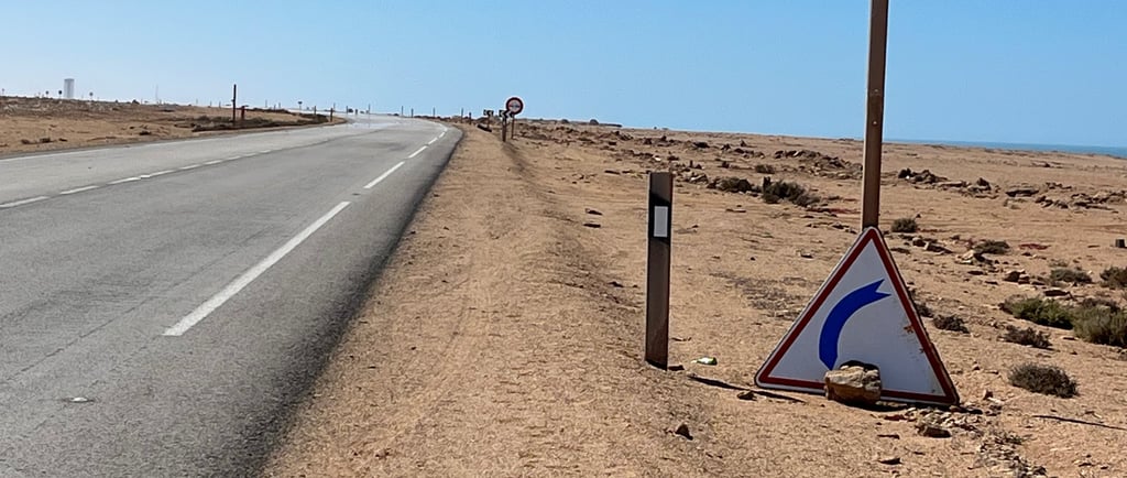 Arrivé au rond point entre la direction Mauritanie et celle menant à Dakhla… je me prend un vent de face sur 15 km… je ralentis considérablement et vois le soleil étirer dangereusement les ombres…