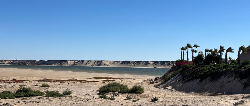 Sortir de la presqu’île, passer la lagune, inlassablement coup de pédale après coup de pédale, mètre après mètre, lutter contre ce vent qui m’empêche, jurer après les camions qui me dérivent de ma trajectoire…. 3h00 durant, 40km plus tard, j’arrive enfin au rond point direction la Mauritanie…Et là on rentre dans un nouveau monde, décidément le Maroc s’arrête à Dakhla… La route se réduit en une route de montagne en mauvais état, le flux des véhicules se restreint à très peu, plus de connexion téléphonique… le vent dans le dos je file au sud et trouve un cabanon de pêche à la plage de El Ahgroub…en réalité un ancien conteneur frigorifique qui fera l’affaire pour se protéger du vent. J’y passe la nuit face a la baie de Dakhla qui s’illumine… la vie est en face, ici on entre dans le désert…