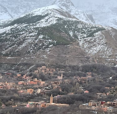 De Marrakech au désert, trois routes se présentent en ce mois de Janvier. Partir vers Ouarzazate et rejoindre ensuite la côte par les oasis du sud et l’anti Atlas. C’est certainement le plus bel itinéraire. Sauf qu’aujourd’hui le vent s’est levé, les nuages s’amoncellent et la pluie arrive en plaine. Nous avons donc fait un saut à Imlill, car tout le monde nous disait qu’il avait neigé dans les hauteurs. Et effectivement, il y avait tempête avec de la pluie annoncée pour ce we, et comme point d’orgue ce dimanche, jour de mon départ à vélo. Il n’est donc raisonnablement pas prudent de prendre des routes à plus de 2000 m d’altitude avec un vélo dans ces conditions. Je vais donc renoncer à cette option.